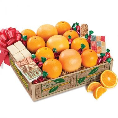 Everything from fruit to a nutty pecan log! Includes our premium grove fresh Navel Oranges, Ruby Red Grapefruit, creamy chocolate squares, delightful chocolate- covered Coconut Patties, a nougat-filled pecan log, and citrus juice candies. Accented with hard fruit candies. Plenty for friends and family to sample and share.