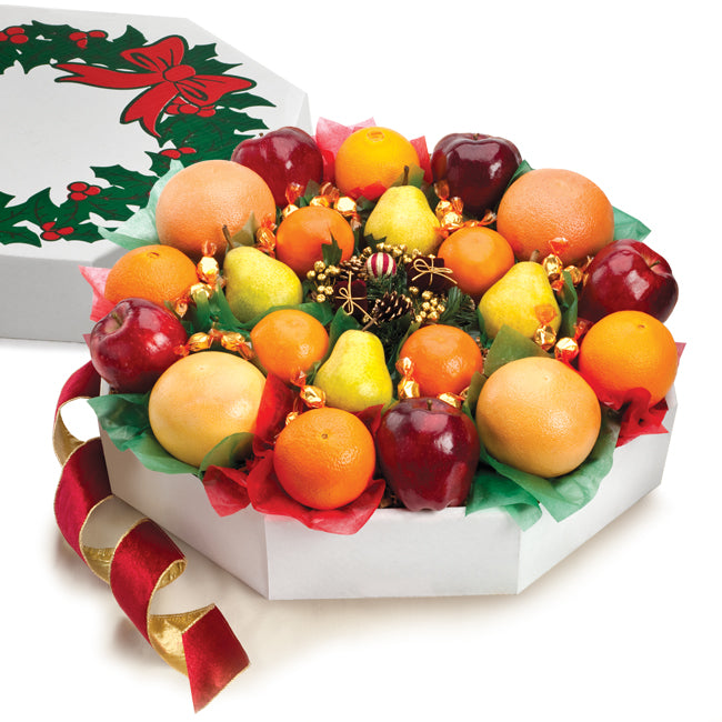 Say "Happy Holidays" with our stunning fruit wreath of Navel Oranges, Ruby Red Grapefruit, easy-to-peel juicy Mandarin Oranges, crisp Apples, d'Anjou Pears - accented with festive strawberry-filled hard candies. Your fruit wreath arrives in a cleverly shaped box, with a festive holly design on the lid. Give delicious holiday greetings with this beautiful gift.